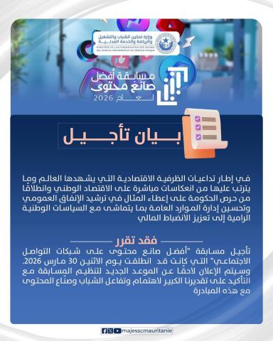 أعلنت وزارة تمكين الشباب والتشغيل والرياضة والخدمة المدنية اليوم، عن تأجيل مسابقة "أفضل صانع محتوى على شبكات التواصل الاجتماعي" لعام 2026، التي كانت قد انطلقت يوم الاثنين الماضي.
